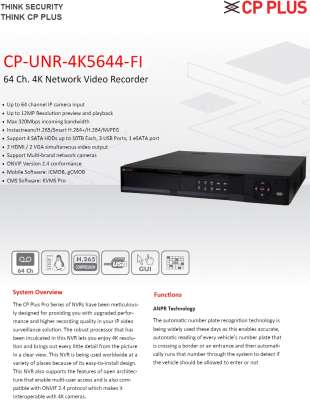 Product Type: NVR Brand: CP Plus Model: CP-UNR-4K5644-FI Qty: 1 Capacity: 64 Channel Unit: nos